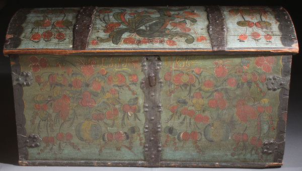 A FINE MID 19TH CENTURY NORWEGIAN WOOD TRUNK WITH ROSEMALING, DATED 1856. The domed top hinged with scallop-cut edge wrought iron straps, decorated in the Telemark style, with stylized florals set in vasiforms and large scrolled foliage on a pale blue ground, the upper front panel inscribed "L.G.I.K. 1856." Height 24 inches (61 cm), width 45.5 inches (115.5 cm), depth 23.5 inches (59.5 cm).