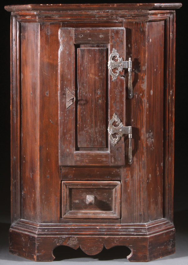 AN EARLY NORWEGIAN WALL HANGING CORNER CABINET, LATE 18TH/EARLY 19TH CENTURY. The paneled door with ornate cut metal work hinges, above a single storage drawer. Height 33 inches (84 cm), width 23 inches (58.5 cm), depth 15 inches (38 cm).