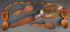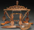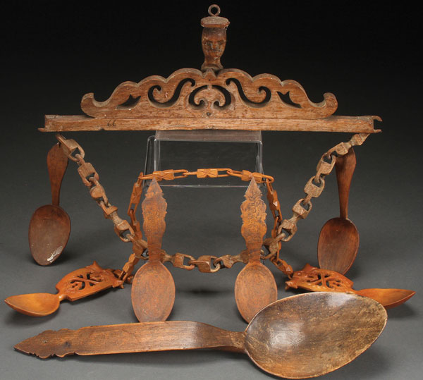 A COLLECTION OF NORWEGIAN FOLK ART CARVED WOODEN SPOONS, EARLY TO LATE 19TH CENTURY. Comprising a two spoon wedding set, each with incised line decoration on flat blade handles, and joined with carved wood-link chain, suspended from an open scrollwork carved hanger with figural head finial, the verso inscribed and dated "K. Olafson - 1825," a pair of carved birch, linked wedding spoons with open work handles and line carved bowls, a large line carved spoon, and a matching pair of line carved spoons with floral decoration. The largest length 17 inches (43 cm).