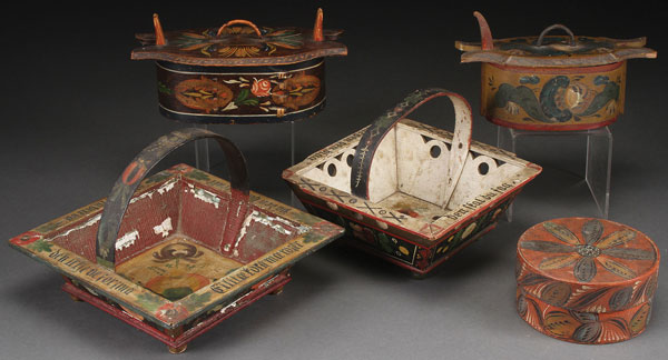 A GROUP OF FIVE NORWEGIAN CARVED WITH ROSEMALING BENT WOOD BOXES AND BASKETS, 19TH CENTURY, TELEMARK STYLE. Comprising two bent handled baskets, with floral decoration on both interior and exteriors and with inscriptions on rims, together with two bentwoodoval boxes with tines, and a round box with over-fitting lid. The largest 8.75 inches square (22 cm square).