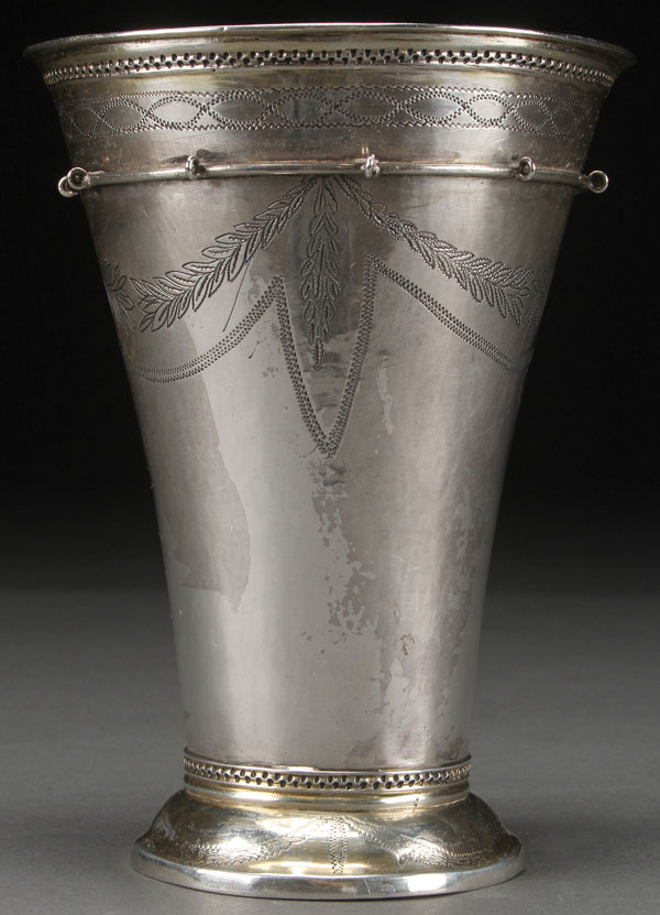 A LARGE EARLY 18TH CENTURY SWEDISH PARCEL-GILT SILVER BEAKER, CIRCA 1701. Apparently unmarked, of tapering cylindrical form with a design of pricked and wriggle worked festoons above an applied rail with suspension loops for ornamental pendants, and raised on a short bell form festoon decorated foot the bottom comprising a 1701 King Charles XV of Sweden 4 mark silver coin. Height 5.5 inches (14cm) weight 7.50 troy oz.