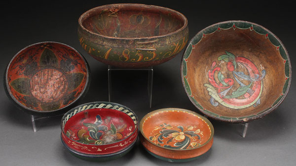 A GROUP OF FIVE NORWEGIAN TURNED AND ROSEMALED WOOD ALE BOWLS, MID 19TH/EARLY 20TH CENTURY. In Hallingdal and Telemark styles, the largest two with inscribed drinking phrases on exterior with one dated 1853. The largest diameter 10.5 inches (26.5 cm).