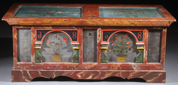 A 19TH CENTURY SWEDISH POLYCHROME WOOD STORAGE CHEST. The front panel with raised arched porticos encompassing floral in urns painted arrangements, and later spuriously painted "1808," below a paneled top with recessed reserves or stylized florals on a pale blue ground, the whole later raised on a custom wood stand. Height 19.75 inches (50 cm), width 50.5 inches (128 cm), depth 20.5 inches (52 cm).