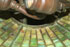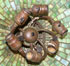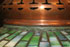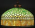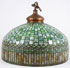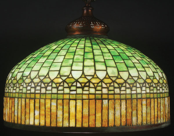 A LARGE AND IMPRESSIVE TIFFANY STUDIOS "CURTAIN BORDER" FAVRILE GLASS AND BRONZE SHADE, CIRCA 1910. Of domed shape with green and opalescent mottled tiles above a ripple textured amber, butterscotch, and opalescent "curtain border," suspended from the original bronze heat cap ventilated with a pierced Morrish design terminating with a heavy bronze gimbal support and illuminated with six sockets on spiral bronze arms. Stamped "Tiffany Studios New York." Diameter 24.25 inches (62.2 cm).