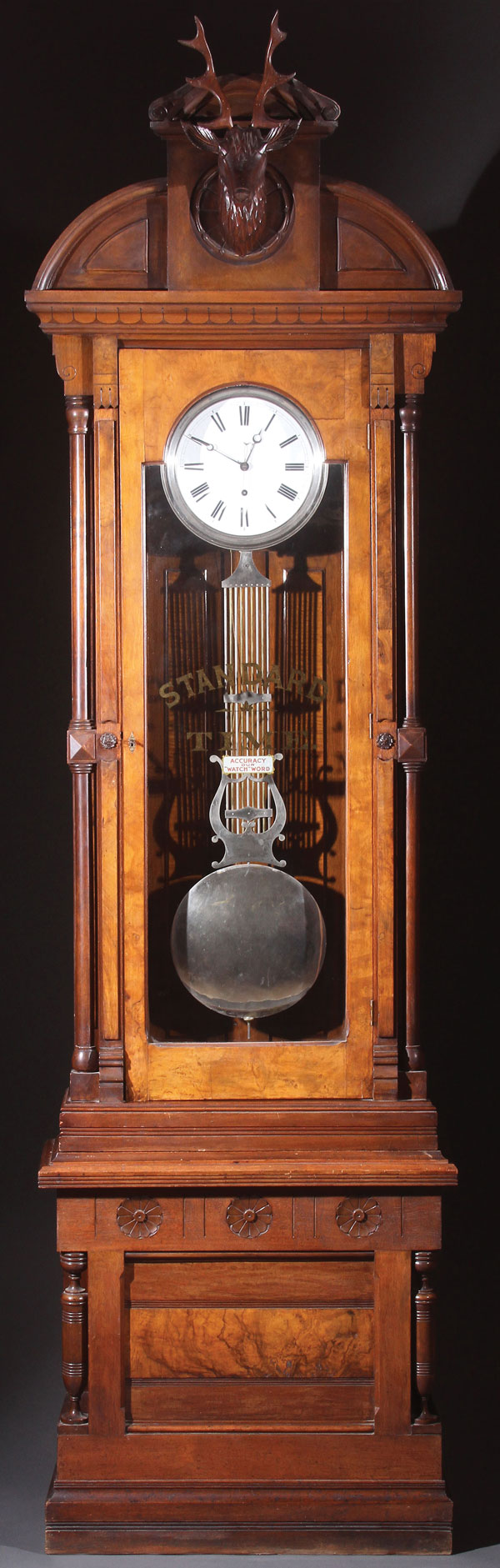 A MONUMENTAL VICTORIAN WALNUT JEWELER'S PINWHEEL REGULATOR FLOOR CLOCK, LATE 19TH CENTURY. Probably by Gilbert, the French pinwheel movement contained in a sheet bronze cage suspended within a burled panel walnut case with large glazed door inscribed "Standard Time" in gilt and with "Accuracy our 'watch' word" decal, surmounted by a triple arched pediment with carved stag trophy mount, the whole raised on a base cabinet with burled walnut panels, turned columns, and carved rosettes. Nice original condition and finish. Height 120.5 inches (306 cm). Width 34 inches (86.25 cm). Depth 12.5 inches (31.5 cm).