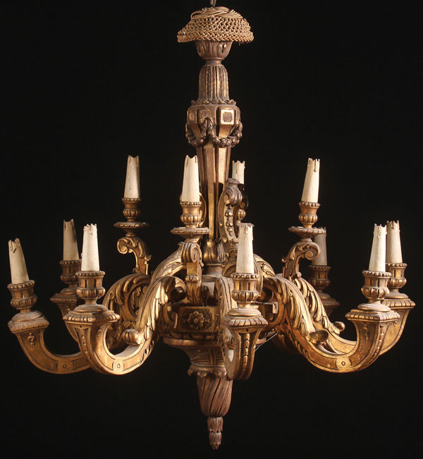 AN ITALIANATE ROCOCO CARVED AND GILT WOOD CHANDELIER, EARLY 2OTH CENTURY. With eight scrolled arms, each terminating with carved wood candle forms concealing electric candelabra sockets, below a secondary tier of four scrolled candle arms. Height 40 inches, diameter 36 inches (101.5 cm x 91. 5 cm)
