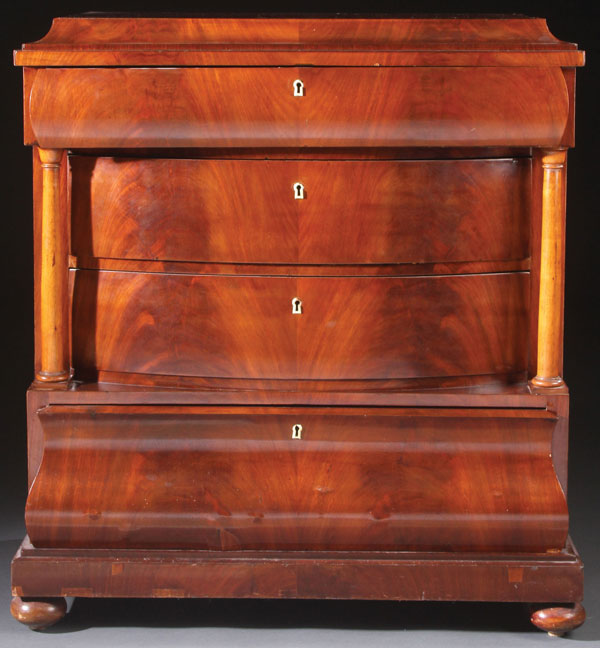 A FINE NORWEGIAN EMPIRE MAHOGANY BOW FRONT FOUR-DRAW CHEST. The two bow front drawers with matched mahogany veneers below a convex faced drawer with divided compartments and sliding mahogany covers surmounted with a cove edged top. The lower most drawer with ogee front. Height 35.5 inches (90 cm). Width 31.75 inches (80.75 cm). Depth 18.5 inches (47 cm).