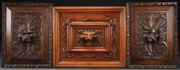 A GROUP OF THREE RENAISSANCE STYLE CARVED WOOD PANELS, GERMAN OR AUSTRIAN, 19TH CENTURY. Comprising a matching pair of oak panels with lion's head mask in deep relief, and a carved walnut panel with extending lion's head carved within a deep panel with scrolled corner brackets. The pair 14.5 inches x 11 inches (37 x 28 cm). The singular 11.75 inches x 16 inches (30 x 40.5 cm).