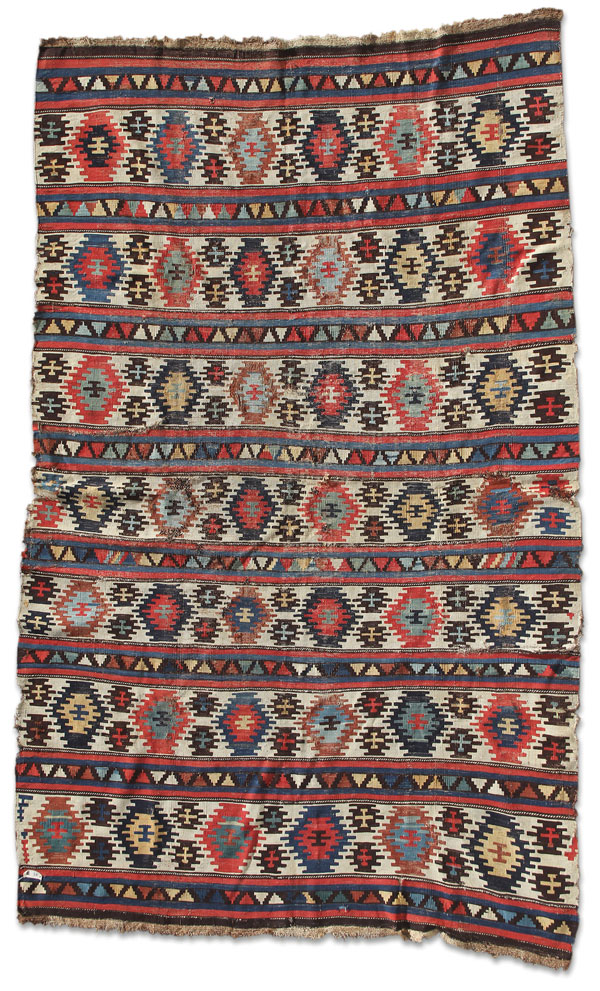 ANTIQUE KILIM CAUCASIAN CARPET, CIRCA 1900. With repeating rows of geometric medallions in blue, brown, red, pale yellow, and brick tones. Some losses and early repairs. 106 inches x 68.5 inches (269 x 174 cm).