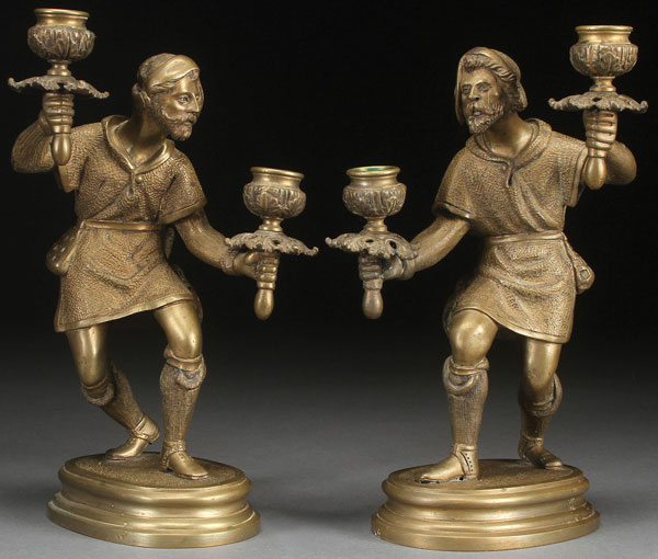 A PAIR OF FRENCH BRONZE FIGURAL CANDLESTICKS, 19TH CENTURY. Each modeled as 18th century woodsmen in opposing form. Gilt bronze patina. Height 9.8 inches (25 cm).