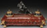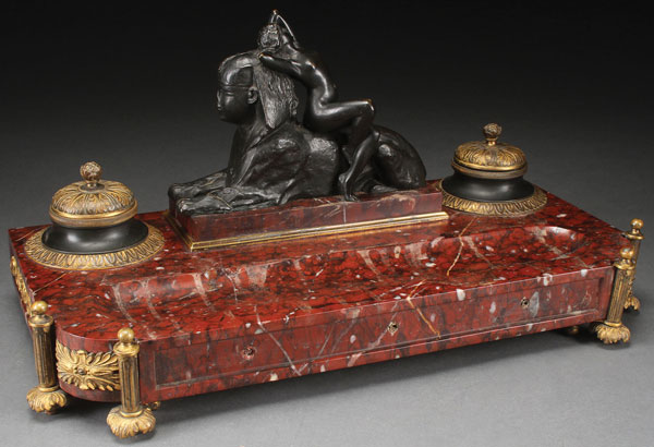 A FRENCH NEO-EGYPTIAN PARCEL GILT BRONZE INK STAND, 19TH CENTURY. The "Griotte Uni" marble base inset with hinged lid inkwells surmounted with the dark patinated bronze figure of a sphinx and posing nude Isis, after T. Herlinger. Length 17 inches, height 8.75 (43.2 x 22.2 cm).