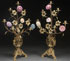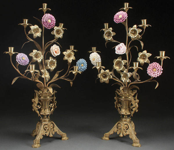 A PAIR OF FRENCH AESTHETIC MOVEMENT GILT BRONZE AND PORCELAIN MOUNTED FLORA FORM CANDELABRA. Each raised on tripod hoof-footed pedestals with winged figural handles. Height 29.75 inches (75.5 cm).