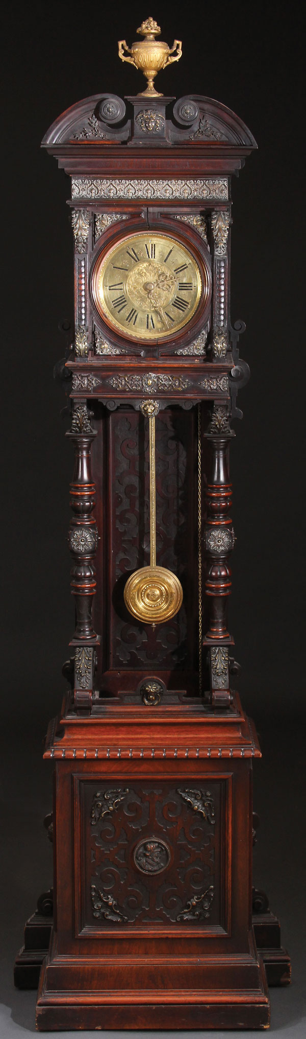 A FINE AUSTRIAN BRONZE MOUNTED WALNUT TALL CASE CLOCK, 19TH CENTURY. In the Renaissance taste, the circular gilt bronze dial etched with griffins within a hinged walnut enclosure with lappet carved columns terminating in scrolled bronze acanthus, below a frieze of alternating scallops and foliate scrolls surmounted by a scrolled broken pediment with bronze facial mask and gilt bronze handled urn finial, the whole raised on turned columns with bronze rosettes and raised strapwork back panel. Height 93 inches, width 27 inches, depth 14 inches (236 cm x 69 x 35.5 cm).