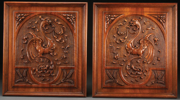 A PAIR OF LARGE CARVED AUSTRIAN STYLE WALNUT PANELS. Each carved in crisp relief with a winged griffin and foliate scrolls within a paneled arched surround. Height 22.5 inches x 20 inches (57 cm x 51 cm).