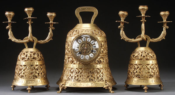 A FRENCH THREE PIECE GILT BRONZE SANCTUARY GARNITURE, 20TH CENTURY. Comprising a bell shape clock and matching scroll arm three light candelabra, each with embossed and reticulated designs of musical angels in quatrefoil cartouches, between panels inscribed with the Lord's Prayer in Latin. Height 12.75 inches (32.5 cm).