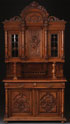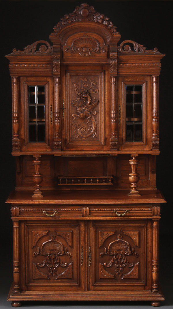 A FINE RENAISSANCE REVIVAL CARVED OAK SIDEBOARD, PROBABLY NORTHERN ITALIAN, LATE 19TH CENTURY. The upper section central door carved with a large figural griffin in deep relief flanked by doors with six beveled lights raised on turned columns surmounting a base with deeply recessed panels and scrolled foliate carvings. Height 101 inches (256.5 cm). Width 54.5 inches (138.2 cm). Depth 20.75 inches (52.5 cm).