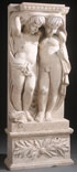 A NEO CLASSIC FIGURAL CARVED LIMESTONE ARCHITECTUAL PANEL, 20TH CENTURY. In two parts, finely carved in three-quarters round, depicting a semi-nude infant boy and girl with drapery raised on a foliate carved plinth. Total height 52 inches (132 cm), width 20 inches (51 cm).
