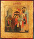 A RUSSIAN ICON OF THE ENTRANCE INTO THE TEMPLE OF THE MOTHER OF GOD, MSTERA, CIRCA 1890. Executed on a gilt ground and inspired by icons of an earlier period, here the three-year-old Mary is presented to the temple priest Zakarius (father of John the Forerunner) by her parents Joakhim and Anna. The upper margin inscribed with the title, "Entrance into the Temple of the Most Holy Mother of God." 12.3 inches x 10.75 inches (31.5 x 27 cm).