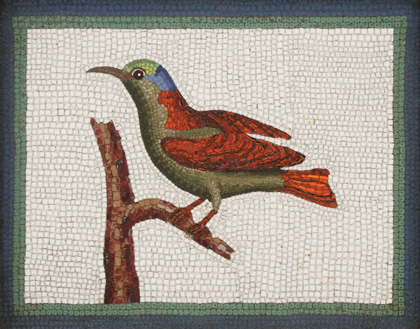 A FINE 18TH CENTURY ITALIAN MICRO MOSAIC, STUDIO OF GIACOMO RAFFAELLI (1753-1836). Depicting a small tropical bird resting on a branch and framed in a green and blue border. Contained in a period gilt frame. Verso of original copper support engraved with the signature "Maccesi"(?) and the abbreviation for Fecit, and further painted with the date 1796. Verso of frame inscribed with the species name "Grimpereau du Bresil." 5.25 inches x 6.5 inches (13 x 16.5 cm).