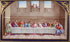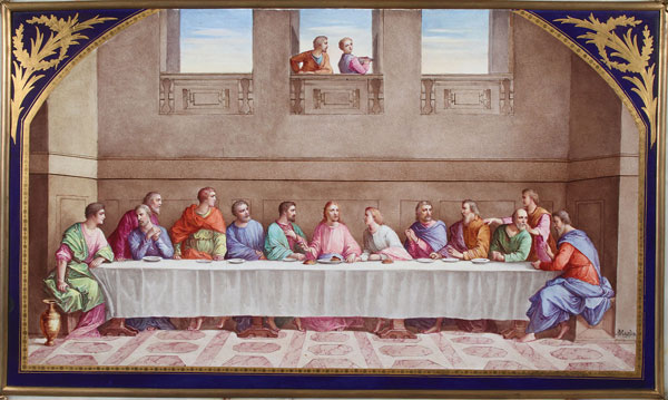 A LARGE AND IMPRESSIVE SEVRES STYLE HAND-PAINTED PORCELAIN PLAQUE OF THE LAST SUPPER, 19TH CENTURY. Painted within a partial feigned arch, reserved on a cobalt blue ground with tooled gilt acanthus and laurel wreaths at upper corners and contained in a gilt bronze frame with champlevé enameled borders, holding a canted onyx surround joined with gilt bronze anthemion mounts. Artist signed lower right "A. MAGLIN." The bronze backed verso with bronze suspension brackets. 19.5 inches x 29 inches (49.5 x 73.7 cm).