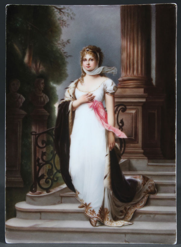 A HAND-PAINTED DRESDEN PORCELAIN PLAQUE OF QUEEN LOUISE, CIRCA 1890. The verso with impressed mold numbers and Dresden paper retailer's label, contained in a period style gilt-wood frame. 7.125 inches x 5 inches (8 x 10.7 cm).