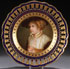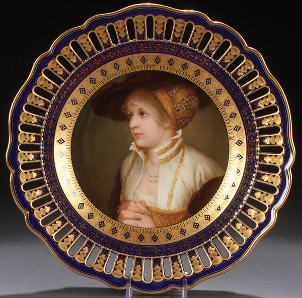 A MEISSEN PORCELAIN PORTRAIT PLATE AFTER FRIEDRICH AUGUST VON KAULBACH (GERMAN 1850-1920) "MAIDEN IN AN OLD GERMAN DRESS. The cavetto finely painted and within a tooled gilt border reserved on cobalt blue with a (Meissen pattern number four) reticulated rim. Titled on verso and with Meissen crossed pommeled sword mark, circa 1900, in blue underglaze. Diameter 9.5 inches (24 cm).