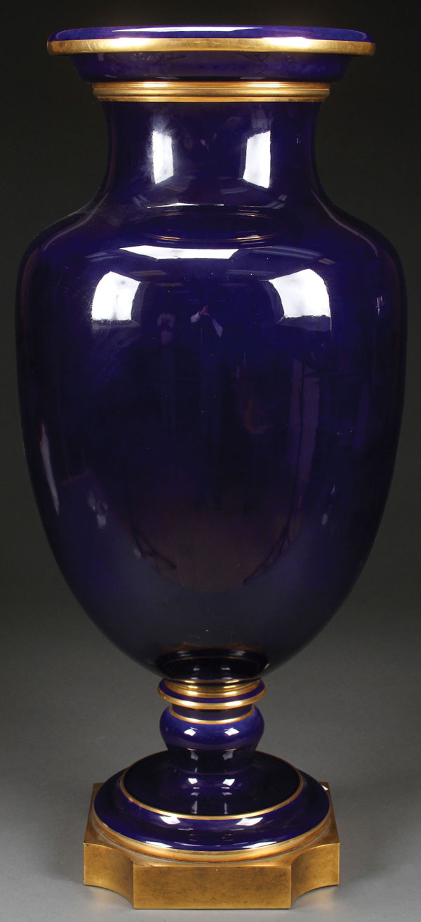 A MONUMENTAL SÉVRES DARK BLUE GROUND BRONZE MOUNTED URN, CIRCA 1869. Of ovoid form above a turned pedestal base with gilt bronze plinth. The interior with second empire Sevres mark, stamped "S.69." Height 34.75 inches (88 cm).