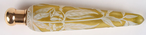 A THOMAS WEBB FOR TIFFANY & CO. GOLD MOUNTED CAMEO GLASS PERFUME, LATE 19TH CENTURY. In citron colored glass overlaid with opal cut with leafy vine and bell-shaped flowers. The monogramed cap stamped "Tiffany & co. 18k." Length 7 inches (18 cm).