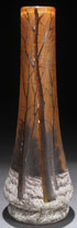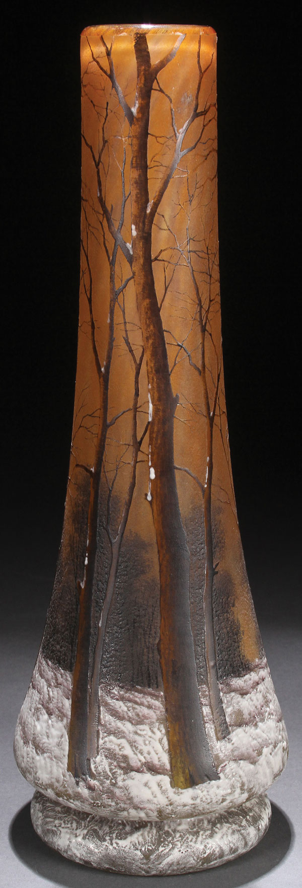 A DAUM NANCY FRENCH ENAMELED CAMEO “WINTER SCENE” ART GLASS VASE, EARLY 20TH CENTURY. Of tapering cylindrical form internally decorated with gray and amber glass. Cut with a design of barren trees on a white enameled snowy ground. The pontil inscribed "Daum Nancy" with Croix De Lorraine. Height 11.75 inches (30 cm).