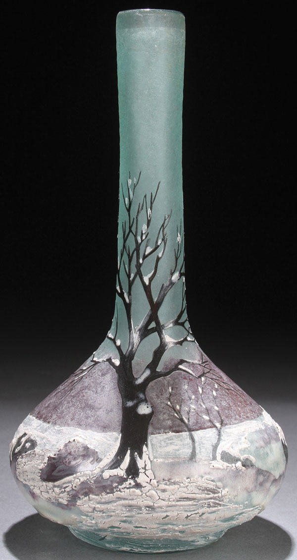 A DELATTE FRENCH ENAMELED CAMEO “WINTER SCENE ART GLASS VASE,” EARLY 20TH CENTURY. Of bottle form in pale blue colored glass cut with a design of leafless trees with a snowy white enameled ground. Inscribed "A. Delatte Nancy." Height 7.5 inches (19 cm).
