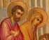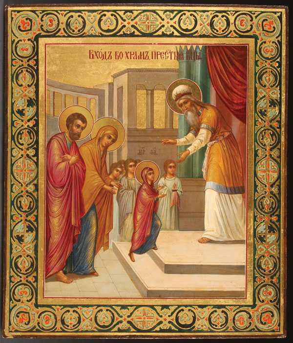 A VERY FINE RUSSIAN ICON OF THE ENTRANCE OF THE MOTHER OF GOD INTO THE TEMPLE, PALEKH, WORKSHOP OF MIKHAIL PARILOV, CIRCA 1915. Exceptionally painted on gilt ground and with extensive gilt shading, here the three year old Mary is presented to the temple priest Zakarius (Father of John the Forerunner), by her parents Joakim and Anna. Behind her are candle-bearing virgins. The upper margin emblazoned with the title, "THE ENTRANCE INTO THE TEMPLE OF THE MOST HOLY MOTHER OF GOD." The borders beautifully painted to simulate cloisonné enamel, the verso with backstamp of icon painting master Mikhail Ivanovich Parilov, village of Palekh, Provence of Vladimir. 12.2 inches x 10.3 inches (31 x 26.5 cm).