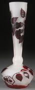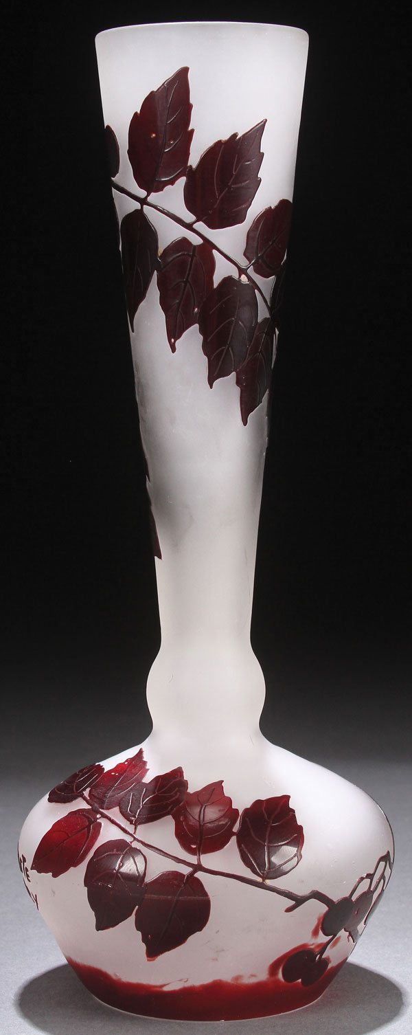 A DELATTE FRENCH CAMEO ART GLASS VASE. EARLY 20TH CENTURY. In gray colored glass overlaid with maroon and cut with a design of “Leaves and Berries.” Signed in cameo “DeLatte Nancy.” Height 8.125 inches (20.5 cm).