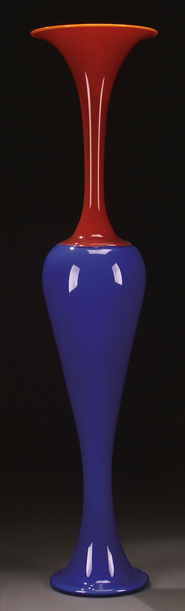 A DANTE MARIONI ART GLASS "GAMBO" VASE, 1998. Of elongated baluster form in azure colored blue glass with applied dark amber trumpet form neck and rim with yellow wrap. The pontil inscribed "Marioni '98." Height 37.5 inches (95.5 cm).