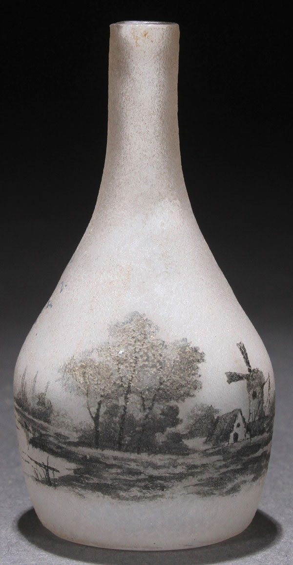A FRENCH DAUM NANCY ART GLASS MINIATURE CABINET VASE, EARLY 20TH CENTURY. In opalescent glass with charcoal enameled coastal scene. The pontil enameled "Daum Nancy" with Croix De Lorraine. Height 2.375 inches (6 cm).