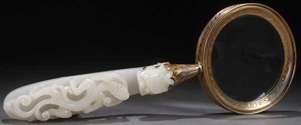 A BENSABBOTT STERLING-GILT AND CHINESE WHITE JADE MAGNIFYING GLASS, EARLY 20TH CENTURY. The Chinese belt hook carved and pierced with a dragon in a fine even toned semi-translucent white jade later mounted with a magnifying lens set in a silver-gilt bezel stamped "Bensabott-sterling." Length 10 inches (25.5 cm). The jade handle 5.25 inches (13.3 cm).