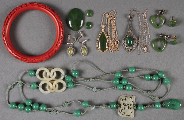 A GROUP OF VINTAGE CHINESE CARVED JADE JEWELRY, 20TH CENTURY. Comprising a green and white jade beaded station necklace of good color and tone with a pierced carved white jade figural plaque and interspersed endless knots, the length 24 inches (61 cm), an Art Deco green jade cabochon and marcasite sterling pendant on sterling chain, the pendant length 2 inches (52 mm), a green jade teardrop pendant with chain in gold tone setting, and other items, including a fine carved cinnabar bangle. (Unillustrated)