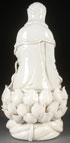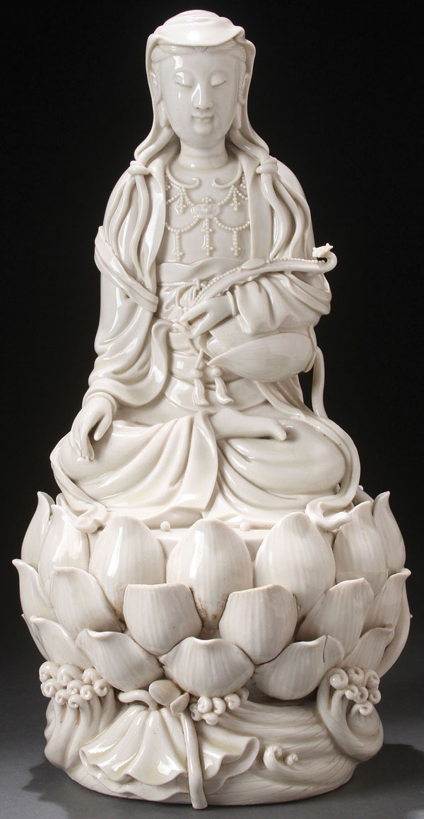 A LARGE CHINESE BLANC DE CHINE FIGURE OF KWAN-YIN, 17TH/18TH CENTURY. Finely modeled in good detail wearing robes with deep folds and accoutrements, seated on a lotus throne with overlapping petals on a frothy, wavy base under a glaze with faint celadon tones. Impressed seal mark and double gourd mark on verso. Height 13.5 inches (34 cm).