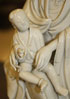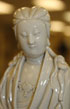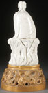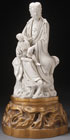 A CHINESE BLANC DE CHINE FIGURE OF KWAN-YIN, 17TH/18TH CENTURY. Depicting the seated figure in flowing robes holding a young boy acolyte atop a rockery throne, incised seal and double mark on verso, raised on a later carved and gilt wood lamp base. The figure 9.75 inches (24.5 cm). Total height 13.75 inches (35 cm).