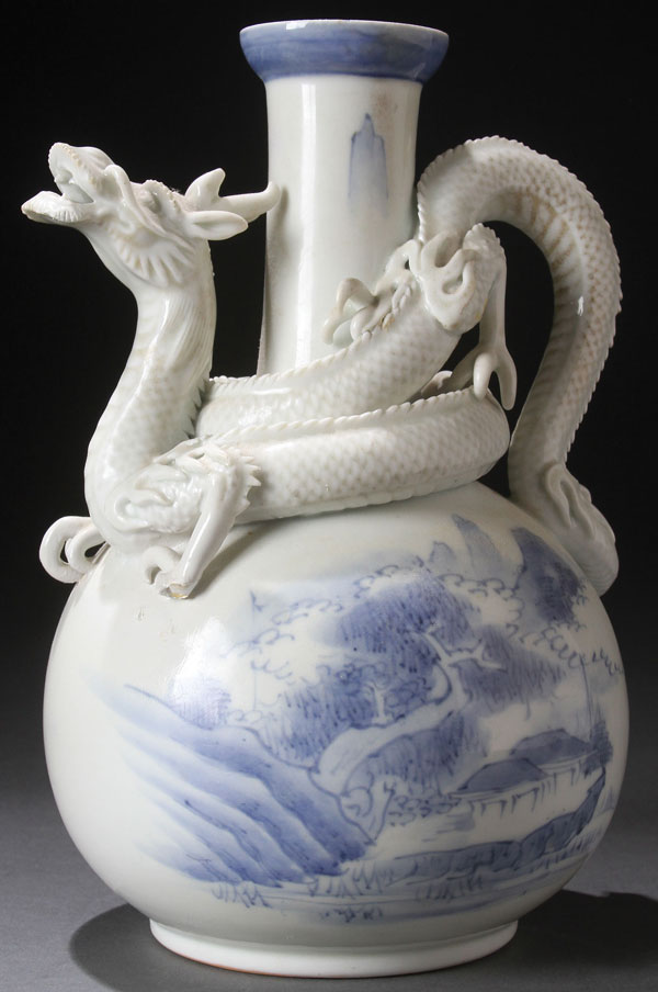A CHINESE BLUE AND WHITE PORCELAIN DRAGON HANDLED WINE JUG, 19TH CENTURY. Of bottled form decorated with a mountainous scene and applied coiled dragon with carved scales encircling the neck forming the handle and spout. Height 9.25 inches (23.2 cm). (Unillustrated)