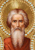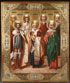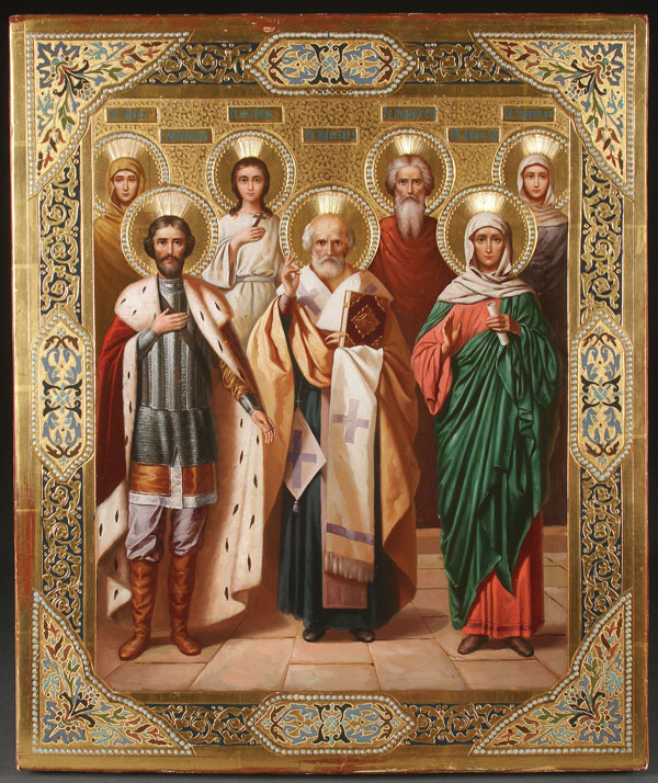 A LARGE AND IMPRESSIVE RUSSIAN ICON OF SELECTED SAINTS, CIRCA 1890. Depicting saints Irina, Vera, Andrew, Serphima, Alexander Nevsky, Nicholas, and the Old Testament Prophetess Anna. The borders ornately incised and painted in faux enamel. 17.6 inches x 14.8 inches (45 x 38 cm).