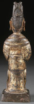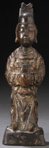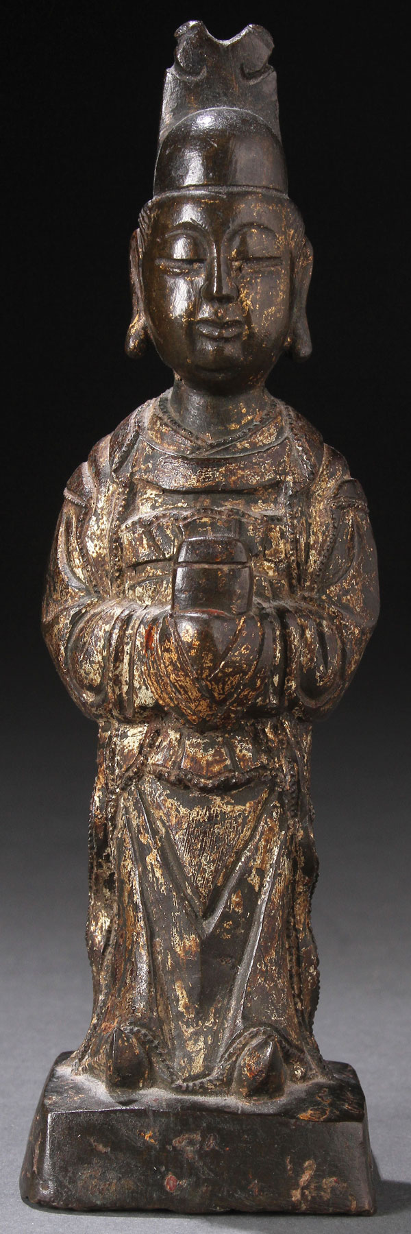 AN ANCIENT CHINESE BRONZE PARCEL GILT FIGURE OF AN OFFICIAL. Depicted in standing form holding a seal box. Height 7.25 inches (18.5 cm).