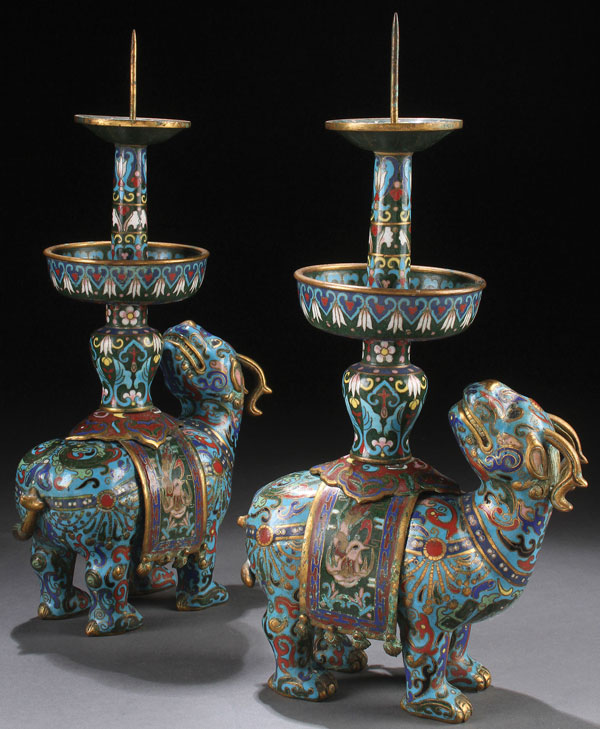 A PAIR OF CHINESE MING STYLE GILT BRONZE FIGURAL CANDLE PRICKETS. Each modeled as a standing mythical beast, supporting a shallow bowl with candle cup and pricket terminal. Height 12.5 inches (32 cm).