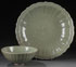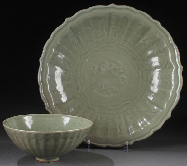 TWO LONGQUAN CELADON GLAZED CERAMIC DISHES, PROBABLY MING DYNASTY OR PERHAPS EARLIER. Comprising a lotus bowl with a fine crackle glaze and raised on a short foot rim, and a barbed rim charger carved with scrolled foliates on interior and exterior sides. Diameter 6.875 inches (17.5 cm) and 12.5 inches (31.7 cm).