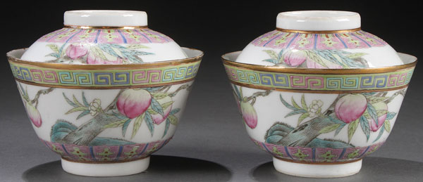 A PAIR OF CHINESE FAMILLE ROSE "SIX PEACHES AND BATS" PORCELAIN COVERED WINE CUPS GUANGXU MARK AND PERIOD. With gently sloping sides, enameled with six peaches and two red oxide bats raised on a short foot rim, with six character Guangxu mark in red. Height 3.75 inches (9.5 cm). Diameter 4.325 inches (11.1 cm).