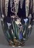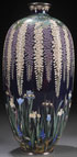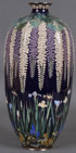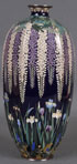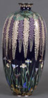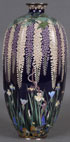 A VERY FINE JAPANESE CLOISONNÉ ENAMELED BRONZE AND SILVER MOUNTED VASE, HAYASHI KODENJI WORKSHOP, MEJI PERIOD, CIRCA 1890. Of ovoid six panel form, decorated with cascading wisteria above irises on a midnight blue ground, signed with incised chop mark on base. Height 9.5 inches (24 cm).