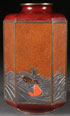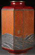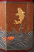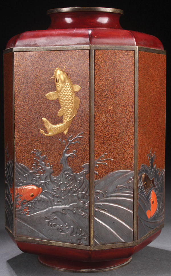 A FINE JAPANESE MIXED METAL VASE WITH LACQUER MAKIE, MEIJI PERIOD. Of eight faceted shape, the bronze body with copper red lacquer shoulder and base framing eight makie lacquered panels, the lower portions in embossed grey colored steel and with four figural carp in coral red and ebony colored lacquer, the fourth, surmounting the waves, in burnished gilt. Signed with “Senpo” seal on verso. Height 8.5 inches (21.5 cm).