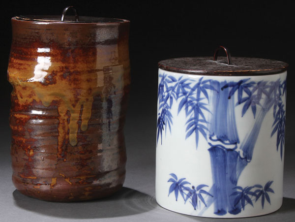 A PAIR OF JAPANESE EDO CERAMICS, MID TO LATE 18TH CENTURY. Comprising a fine Takatori Ware brown glazed tea ceremony water vessel with lacquered lid and a Hirado porcelain water jar with blue underglazed bamboo design and surmounted with a lacquer cover. Height 6.5 inches (16.5 cm) and 5 inches (13 cm).