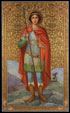 A LARGE AND IMPRESSIVE RUSSIAN ICON OF ST. GEORGE, CIRCA 1890. Realistically rendered, here George is depicted in the garb of a Roman soldier, he holds a lance and sword and behind him in the foreground is a slain dragon. Executed on an exceedingly ornate, incised gilt ground with enameled halo and the borders also with enameling to simulate cloisonné. He is identified by the shoulder-height inscription which calls him, "The Holy Great George the Victorious." 38.5 inches x 23.5 inches (98 x 60 cm).