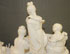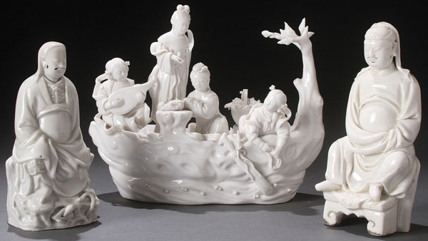 A GROUP OF THREE CHINESE BLANC DE CHINE PORCELAIN FIGURES, 19TH CENTURY. Comprising a seated figure of Chen-Wi on a rockery base with serpent and turtle, a group of four immortals in a fish shaped boat, and a seated figure of Kuanti atop a lion pelt covered throne. The largest 7 inches high (18 cm), 8.5 inches in length (21.5 cm).