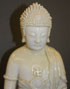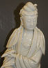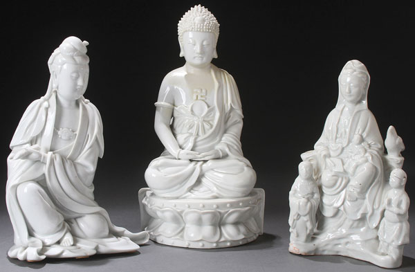 THREE CHINESE BLANC DE CHINE DEITY FIGURES, 18TH AND 19TH CENTURY. Comprising an early seated Kwan-Yin with scroll and flowing robes, a seated Buddha on double lotus throne and impressed seal mark on verso (repaired), and an early seated Kwan-Yin with boy acolyte and attendants (loss of one flanking bird). The largest 10.5 inches (26.5 cm).